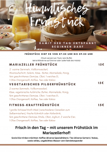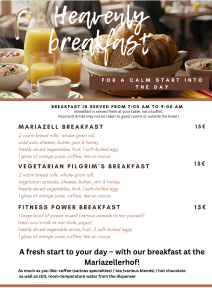 (2 warme Semmeln, Vollkornweckerl, Käse, vegetarische Aufstriche, Butter, Marmelade, Honig, fein geschnittenes Gemüse, Obst, 1 weiches Ei. Kaffee, Tee, Kakao, Fruchtsäfte, Wasser)